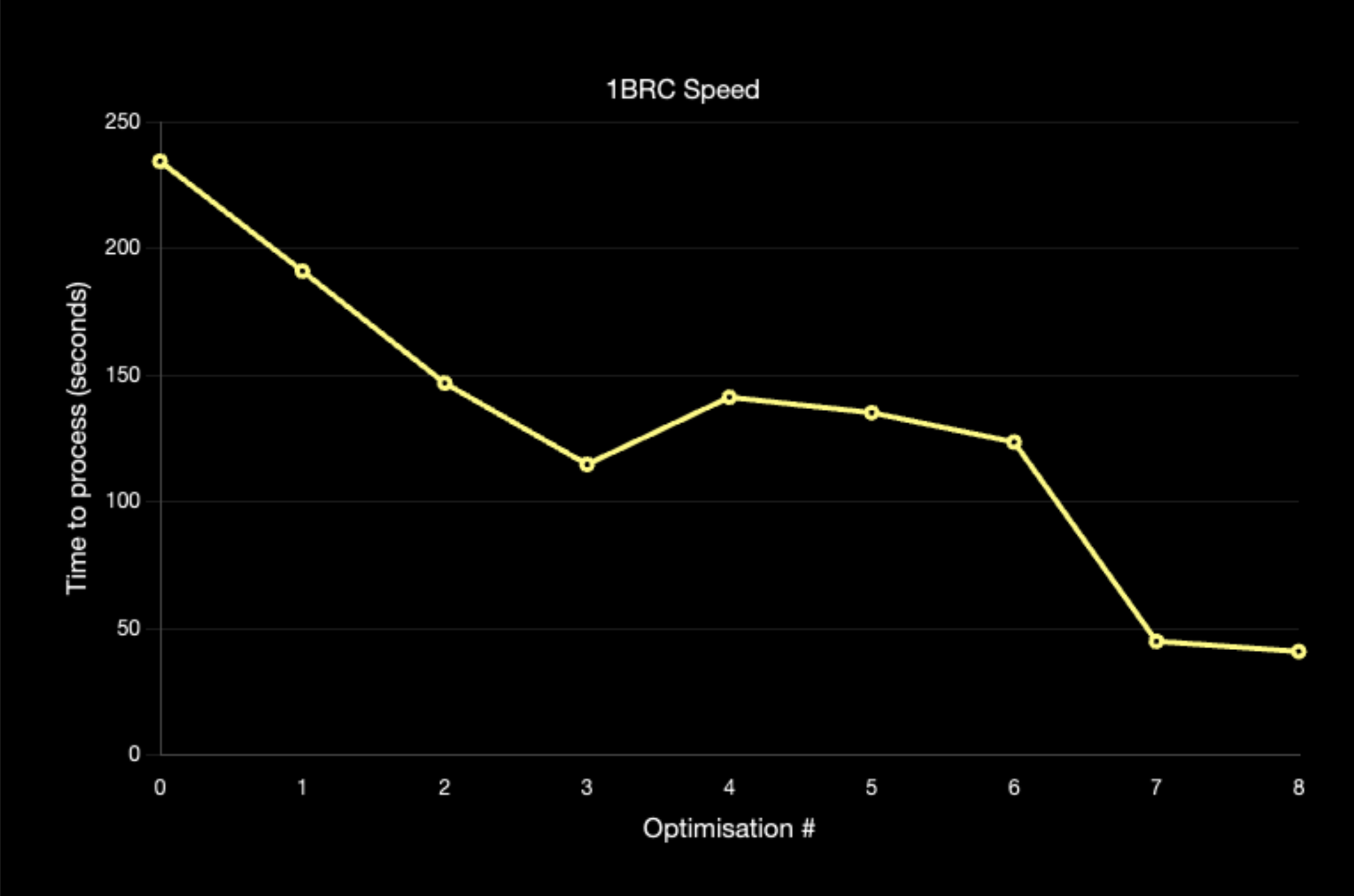 Ultimately, this was the final single threaded optimisation and I was quite happy with my final time of 44.9x seconds to process 1 billion rows on a single thread.